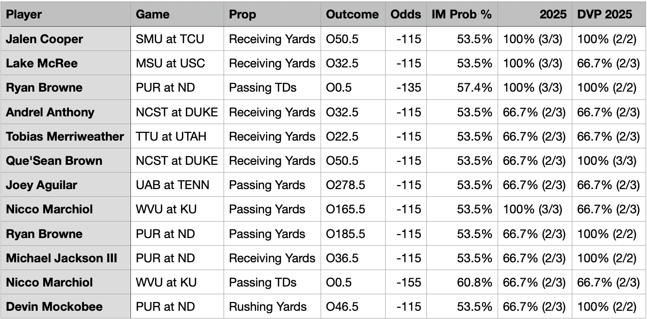 - Jalen Cooper (SMU WR) – Over 50.5 Receiving Yards (3/3)