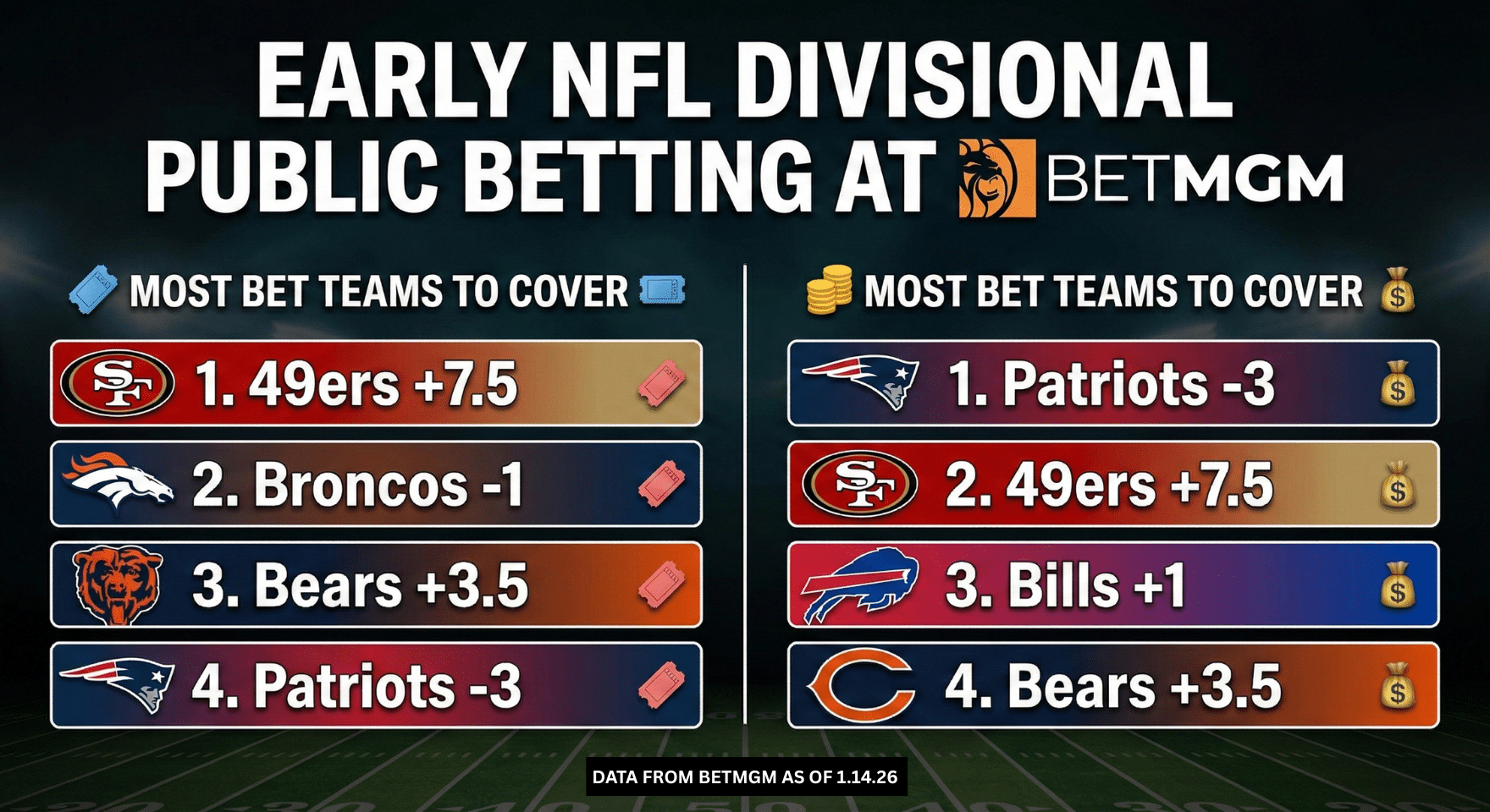 Below is the complete day-by-day breakdown of NFL Divisional Round playoffs action, with spreads, totals, moneylines, handle, and bet percentages for every matchup. Whether you’re looking to ride the wave, load up on NFL props data, fade the crowd, or simply see which teams America has irrational confidence in, the full tables give you a clear snapshot of how the public is playing this week.